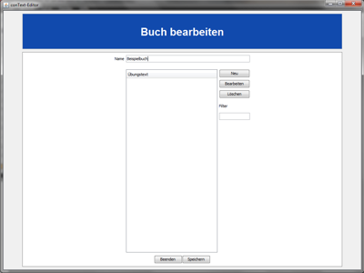 Als nächstes gelangen Sie zu einem Eingabefenster, bei dem Sie einen Namen für das Buch vergeben können. In der Liste darunter erscheinen die verschiedenen Übungstexte. Sie können
