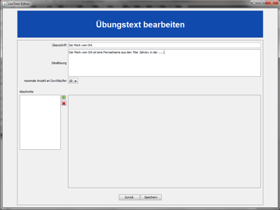 Jetzt wird eine Eingabemaske für den Text angezeigt. Bitte vergeben Sie einen Gesamttitel für den Text. Erstellen Sie nun bis zu fünf Textabschnitte, die ebenfalls