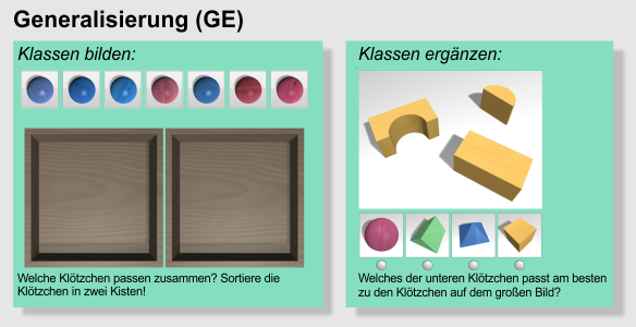 Die obige Abbildung zeigt zwei verschiedene Aufgabenformen der Generalisierung. Bei Klassen bilden besteht die Aufgabe darin, aus einer Menge von Objekten alle diejenigen auszuwählen, die ein gleiches Merkmal besitzen, während bei Klassen ergänzen die Klasse schon vorgegeben ist und lediglich ergänzt werden muss. Das gesuchte Merkmal ist in beiden Beispielen die Farbe der Klötzchen.