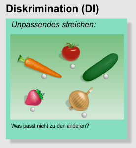 Bei der Dikrimination geht es darum, Unterschiede zwischen Merkmal zu erkennen. In der Abbildung handelt es sich zum Beispiel bei allen Objekten um Gemüse außer bei der Erdbeere. Die Erdbeere passt also nicht zu den anderen.