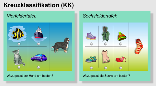 Bei der Kreuzklassifikation muss verstanden werden, dass Objekte sich hinsichtlich mancher Merkmale von anderen unterscheiden können, während sie hinsichtlich anderer Merkmale gleich sind. In der Beispielaufgabe zur Sechsfeldertafel sind in der oberen Reihe Kleidungsstücke dargestellt, die man bei kaltem Wetter anzieht, während in der unteren Reihe Sommerkleidung zu sehen ist. Die Spalten unterscheiden sich darin, zu welchem Körperteil das jeweilige Kleidungsstück gehört (Fuß, Rumpf, Kopf). Die Socke passt am besten zum Schuh in der oberen Reihe, da sie bei kaltem Wetter an den Fuß gezogen wird. Entscheidend ist nun, dass die richtige Lösung nur dann gefunden werden kann, wenn die Aspekte Außentemperatur und Körperteil gleichzeitig beachtet werden.