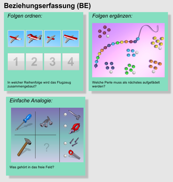 Bei der Beziehungserfassung geht es im Gegensatz zur Generalisierung und Diskrimination nicht um Merkmale, sondern um Relationen zwischen Objekten. Bei der dargestellten Aufgabe der Aufgabenform Folgen ordnen geht es beispielsweise darum, die richtige Abfolge des Zusammenbaus eines Spielzeugflugzeugs herauszufinden.