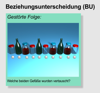 Bei der Beziehungsunterscheidung ist eine bestimmte Relation zwischen Objekten vorgegeben, von der an einer Stelle abgewichen wird. Diese Stelle muss erkannt werden. In der dargestellten Aufgabe lautet z.B. die richtige Reihenfolge: Glas mit rotem Deckel, grüne Flasche, Glas mit blauem Deckel. An Position 6 und 7 (von links gesehen) sind die beiden Gläser aber vertauscht.