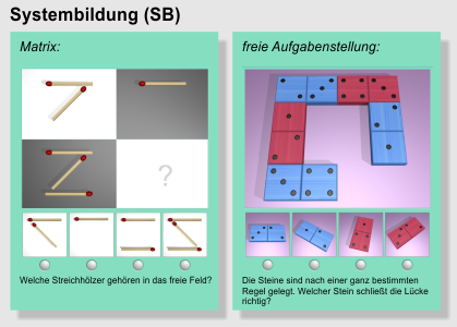 Bei der Systembildung geht es darum, nicht nur eine, sondern mehrere (in den Denkspielen mit Elfe und Mathis maximal zwei) Relationen gleichzeitig zu beachten. Ähnlich wie bei der Kreuzklassifikation kann ein Objekt hinsichtlich einer Relation zu anderen Objekten passen, hinsichtlich einer anderen aber nicht. So muss im dargestellten Aufgabenbeispiel mit freier Aufgabenstellung sowohl die Anordnung der Farben als auch die Anzahl der Punkte auf den Steinen beachtet werden.