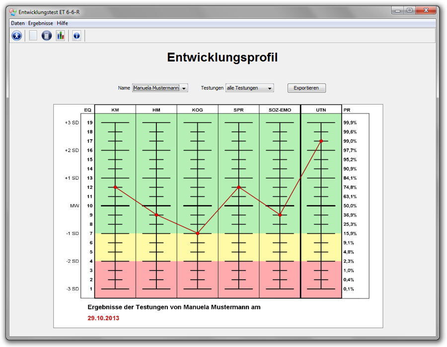 - Auswertung: Die Anzahl der Auswertungen ist ungebrenzt. Das Programm ist auch zeitlich uneingeschränkt anwendbar. Das Programm ermittelt Normwerte, weist auf nicht erreichte Grenzsteine hin, stellt Profilverläufe bei Mehrfachtestungen dar und interpretiert die erreichten Werte unhaltlich.