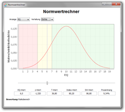 - Weitere Funktionen: Das Programm verfügt über eine ausführliche Hilfe, über einen Normwertrechner, mit Hilfe dessen sich Normwertskalen einfach ineinander umrechnen lassen, sowie eine integrierte Update-Funktion. Daten verschiedener Testpersonen können außerdem zusammengefasst und zur Weiterverwendung in Statistiksoftware oder Datenkalkulationsprogrammen exportiert werden. Die Normtabellen können dynamisch visualisiert werden, z. B. um Änderungen in den Rohwerten zu veranschaulichen.