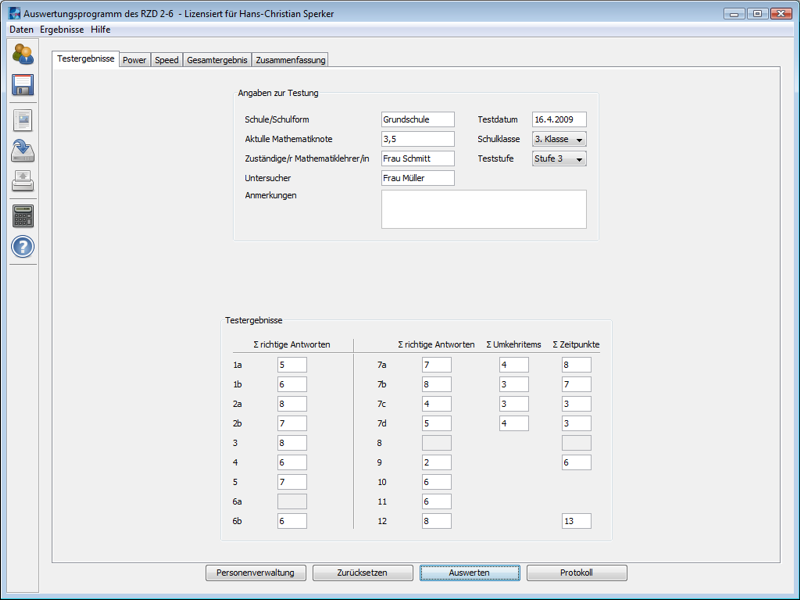 Die Leistungen des Kindes werden sowohl in Hinblick auf die Lösung der Aufgaben (Powerkomponente) als auch in Form eines gewichteten Zeitwerts (Speedkomponente) erfasst. Das Auswertungsprogramm berechnet auf der Basis der Leistungen des Kindes automatisch die Normwerte der Untertests und ermittelt die Power- und Speedkomponente. Die Daten werden in Form von Balkendiagrammen visualisiert und als Ergebnisreport angezeigt. Dabei gibt das Programm Hinweise zur Interpretation der Werte.