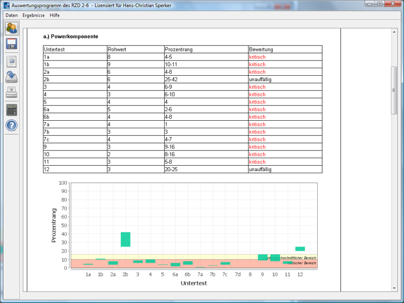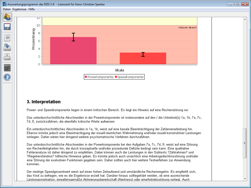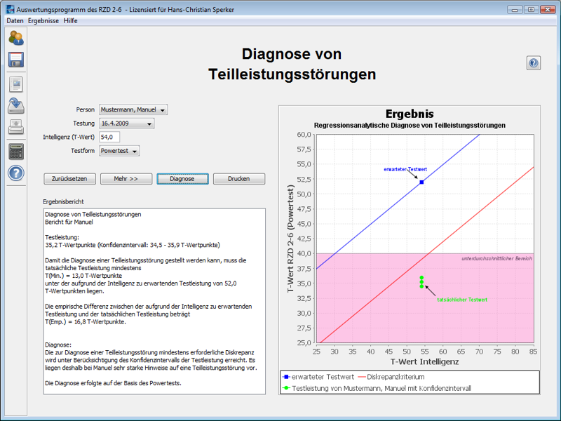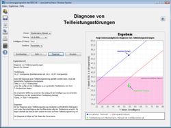 Zusätzlich zu diesen Grundfunktionen stehen weiterführende Analysen zur Verfügung: Zum einen lassen sich bei Wiederholungsmessungen die Änderungen des Leistungsprofils eines Kindes leicht visualisieren und inferenzstatistisch absichern. Hiermit ist es möglich, Therapiefortschritte zu dokumentieren oder signifikante Unterschiede zwischen Speed- und Powerkomponente aufzudecken. Das Programm rechnet die Normwerte auf Wunsch automatisch in T-Werte um. Zusätzlich enthält es ein Modul zur Diagnose von Teilleistungsstörungen nach dem traditionellen Diskrepanz-, als auch nach dem Regressionsmodell. Auch hier werden die Ergebnisse grafisch dargestellt und oder als Report angezeigt, der gespeichert und ausgedruckt werden kann.