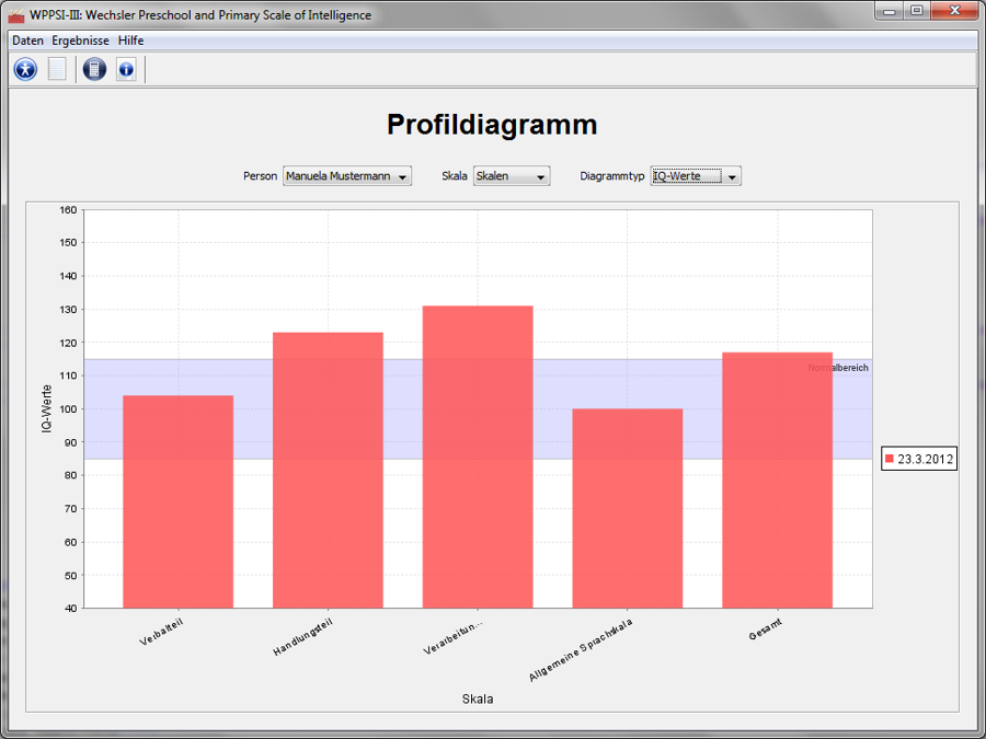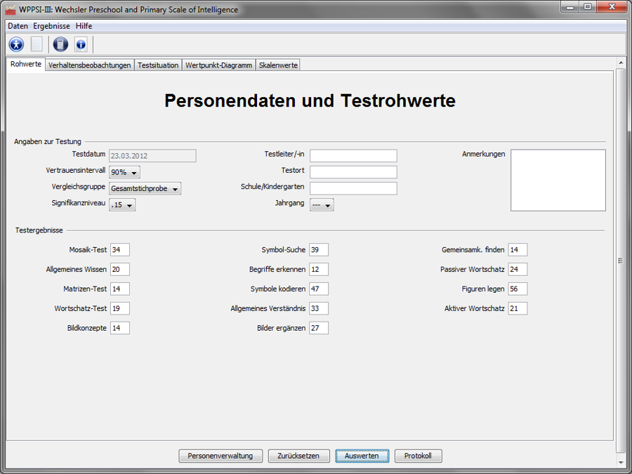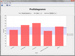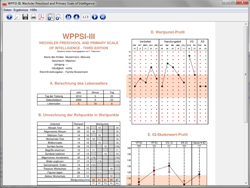 Das Auswertungsprogramm für die WPPSI-III berechnet auf der Basis der Leistungen des Kindes automatisch die Indexwerte der Untertests und der Skalen, ermittelt signifikante Differenzen, erstellt einen Report der Ergebnisse und ermöglicht die Visualisierung der Profile in Form von Index-, T- und IQ-Werten sowie Prozenträngen.