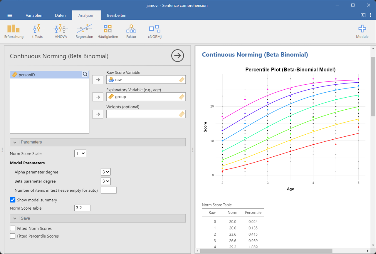 - Value for norm score table: Since the models are continuous, you explicitly need to specify the age for which you would like to generate a norm table.