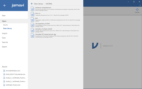 The cNORMj module includes the dataset from the cNORM package. You can use these to get accustomed to the analyses. To load the dataset, please click on the burger menu at the top left and select 'Open'.