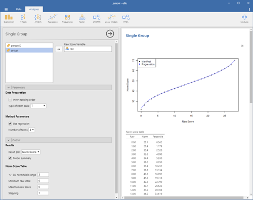- Use regression: Per default, the module uses regression to model the relationship between raw and norm scores. If this option is deactivated, it simply reports the manifest percentiles