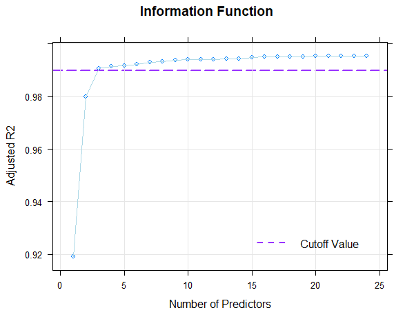Das zurückgegebene Objekt 'model' enthält sowohl die Daten (model$data) als auch das Regressionsmodell (model$model). Alle Informationen über die Modellselektion können unter 'model$model$subsets' abgerufen werden. Der Prozess der Variablenselektion wird Schritt für Schritt in 'outmat' und 'which' aufgelistet. Dort findet man R2, Radjusted2, Mallow's Cp und BIC. Die Regressionskoeffizienten für das selektierte Modell ('model$model$coefficients') sind ebenso verfügbar wie die angepassten Werte ('model$model$fitted.values') und alle weiteren Informationen. Eine Tabelle mit den entsprechenden Informationen kann mithilfe des folgenden Codes gedruckt werden: