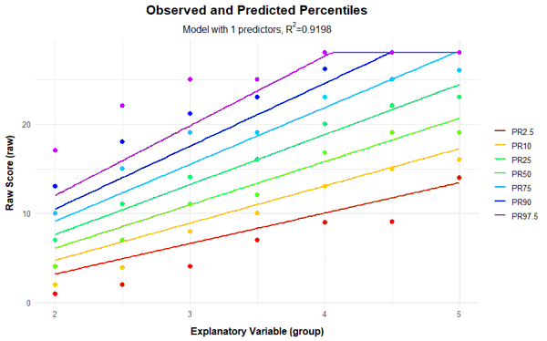 Wie aus dem obigen Diagramm ersichtlich wird, verlaufen die Perzentile des Normierungsmodells über alle Stufen der explanatorischen Variable hinweg relativ glatt und stimmen gut mit den manifesten Daten überein. Kleine Schwankungen zwischen den einzelnen Gruppen werden eliminiert. Das oberste Perzentilband (PR = 97.5) verläuft zwar ab der vierten Klassenstufe nur noch horizontal. Dies stellt allerdings keine Limitation des Modells, sondern einen Deckeneffekt des Tests dar, da ab hier der maximale Rohwert von 28 erreicht wird. Modellgrenzen treten also nicht nur deshalb auf, weil die Methode nicht perfekt ist, sondern auch, weil die zugrundegelegten Testverfahren nur einen eingeschränkten Messbereich besitzen. Anders ausgedrückt zeigen sich die Grenzen der Modellierbarkeit oft an denjenigen Stellen, an denen der Test zu starke Boden- oder Deckeneffekte besitzt oder an denen die Normierungsstichprobe zu stark ausgedünnt ist. Normalerweise erreicht man die Grenzen der Modellierbarkeit erst an den Rändern des Alters- oder Leistungsbereiches der Normierungsstichprobe oder sogar erst darüber hinaus. Achten Sie deshalb bei der Überprüfung der Perzentillinien vor allem auf die Verläufe des Modells an den Rändern.