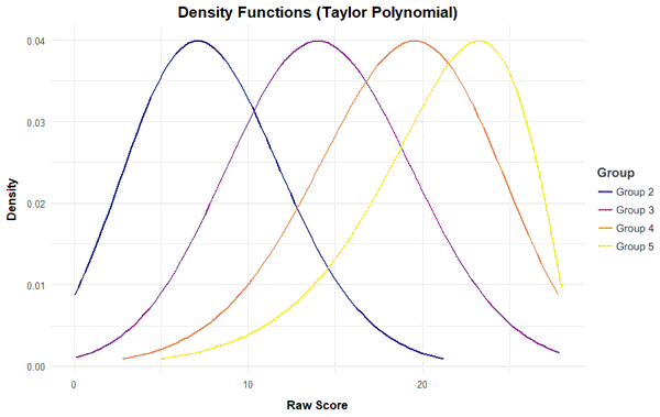 Die 'plot("density")'-Funktion stellt die vom Modell geschätzte Wahrscheinlichkeitsdichte für die Rohwerte dar. Die Methode kann genutzt werden, um Abweichung der Testergebnisse von der Normalverteilung besser sichtbar zu machen.