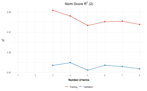 Wie bereits weiter oben beschrieben, besteht das Ziel des Modellierungsprozesses nicht unbedingt darin, maximale Varianzaufklärung zu erreichen. Eine zu enge Anpassung des Modells an die Trainingsdaten stellt nämlich mit hoher Wahrscheinlichkeit eine Überanpassung an die (fehlerbehaftete) Stichprobe dar. Stattdessen sollen die Modelle die (in der Regel unbekannte) Verteilung in der Referenzpopulation möglichst gut vorhersagen. Um abzuschätzen, wie gut dies gelingt, kann zusätzlich eine Kreuzvalidierung durchgeführt werden. Dabei werden wiederholt 80 Prozent der Daten als Trainingsdaten gezogen und an den verbleibenden 20 Prozent validiert. Die Trainingsdaten werden nach Normgruppe geschichtet, aber innerhalb jeder Normgruppe randomisiert gezogen. Wie bei den Perzentilserien werden auch bei der Kreuzvalidierung Modelle mit zunehmender Anzahl von Termen (d. h. Prädiktoren) berechnet. Für jede Anzahl von Termen werden für die Trainingsdaten, die Validierungsdaten und den kompletten Datensatz jeweils der RMSE (bezogen auf Rohwerte oder Normwerte) und R2 (bezogen auf Normwerte) berechnet. Zusätzlich kann der 'Crossfit' als Verhältnis von R2 in Training und Validierung berechnet werden.