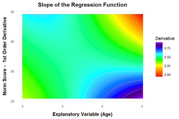 In diesem Zusammenhang steht auch die 'plot("derivative")'-Funktion zur Verfügung. Mit dieser Funktion lässt sich die erste partielle Ableitung der Regressionsfunktion nach der Personenlokation grafisch darstellen. So lässt sich beispielsweise leicht überprüfen, an welchen Stellen diese Ableitung einen Nulldurchgang hat. An diesen Stellen kommt die Modellgültigkeit normalerweise an ihre Grenzen.
