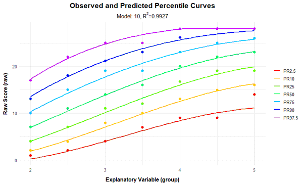 Die manifesten Daten werden im Diagramm als Punkte, die modellierten Perzentile als Linien dargestellt. Der Rohwertebereich wird automatisch basierend auf den Werten aus dem ursprünglichen Datensatz ermittelt. Er kann mittels der Parameter 'minRaw' und 'maxRaw'aber auch explizit angegeben werden.