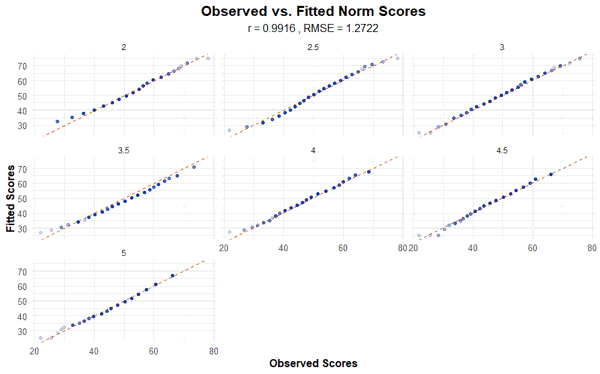 Die Funktion entspricht der Funktion plot("raw"), nur dass hier die manifesten und projizierten Normwerte gegeneinander geplottet werden. Bitte geben Sie zudem die Grenzen des Normwertbereichs an. Im konkreten Beispiel sind dies T-Werte von 25 bis 75. Die Werte decken also den Bereich von -2.5 bis +2.5 Standardabweichungen um den Mittelwert ab.