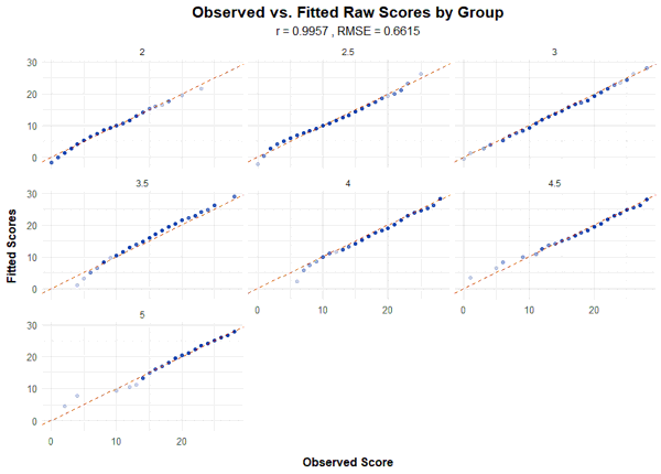Dass man eine relativ gut modellierbare Skala vorliegen hat, erkennt man daran, dass es möglich ist, konsistente Modelle zu finden, die mehr als 99 % der Datenvarianz erklären. Im vorliegenden Fall wird dieser Wert bereits mit drei Prädiktoren erreicht (Radjusted2 = .991). Im Prinzip liegen hier also eine ganze Reihe an sparsameren Modellen vor, die zur Auswahl in Frage kämen. Mit 8 Prädiktoren werden 99.3 % der Datenvarianz durch das Modell erklärt, also nur 0.2 % mehr als mit drei Prädiktoren. Allerdings führen selbst Erhöhungen im Promillebereich in extremen Leistungsbereichen bisweilen zu bedeutsamen Verbesserungen des Normierungsmodells. Über 8 Prädiktoren hinaus führt eine weitere Hinzunahme von Prädiktoren hingegen nicht einmal mehr zu Veränderungen im Promillebereich. Modelle zwischen 3 und 8 Prädiktoren scheinen also prinzipiell geeignet zu sein. Welches Modell davon am Ende ausgewählt werden sollte, entscheiden wir mittels der folgenden Kreuzvalidierung.