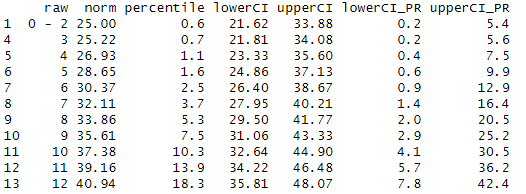 rawTable(3.5, model, minRaw = 0, maxRaw = 28, minNorm = 25, maxNorm = 75, step = 1, CI = .95, reliability = .89)