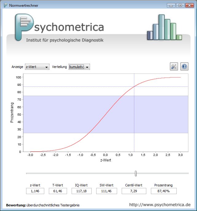 Der Normwertrechner soll die Umrechnung der verschiedenen Normwert-Skalen erleichtern. Man kann entweder per Schieberegler Werte mit der Maus einstellen oder diese direkt in die Textfelder eingeben. Das Programm errechnet automatisch die Entsprechungen in den anderen Normwertskalen.