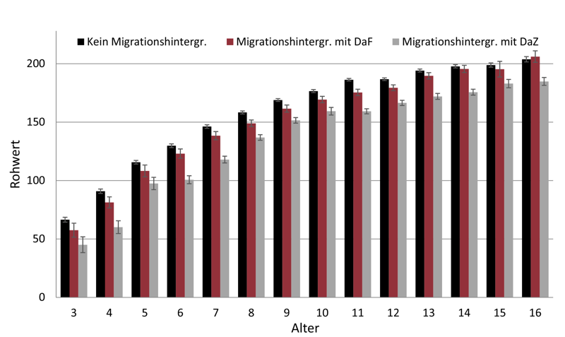 | Altersverlauf der im Mittel erzielten Leistungen | Leistungsunterschiede in Abhängigkeit des sprachlichen Hintergrunds Anmerkung: |