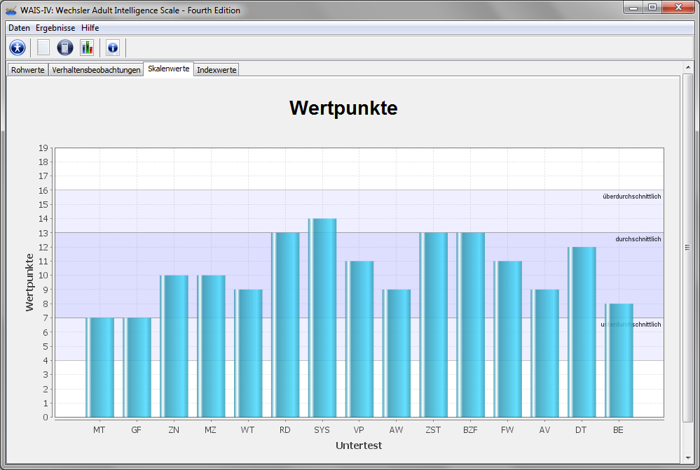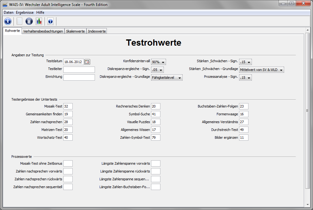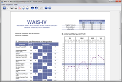 - Dateneingabe: Das Programm verfügt über eine übersichtliche Probandenverwaltung und komfortable Eingabe von Testergebnissen. Bereits bei der Eingabe werden Werte auf Plausibilität geprüft und Hintergrundinformationen zu den Untertests angezeigt. Auch lässt sich die Verhaltensbeobachtung protokollieren.