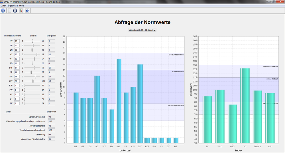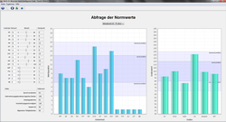 - Weitere Funktionen: Das Programm verfügt über eine ausführliche Online-Hilfe, über einen Normwertrechner, mit Hilfe dessen sich Normwertskalen einfach ineinander umrechnen lassen, sowie eine integrierte Update-Funktion. Daten verschiedener Testpersonen können außerdem zusammengefasst und zur Weiterverwendung in Statistiksoftware oder Datenkalkulationsprogrammen exportiert werden. Die Normtabellen können dynamisch visualisiert werden, z. B. um Änderungen in den Rohwerten zu veranschaulichen.
