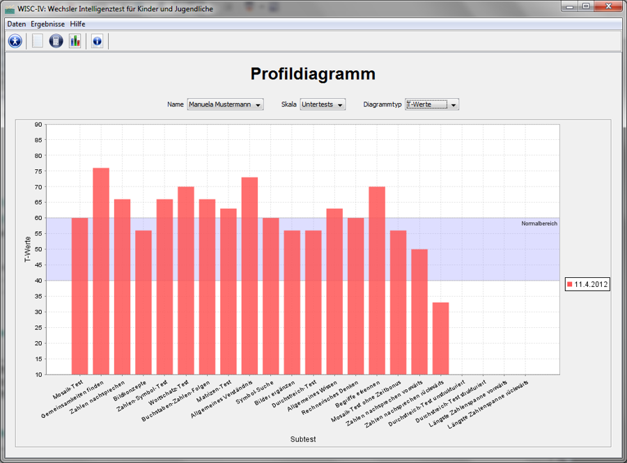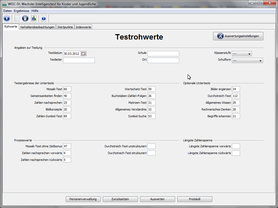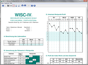 Die von unserer Firma erstellte Auswertungssoftware ökonomisiert die Auswertung der Wechsler Intelligence Scale for Children - Version IV und schützt Sie vor Auswertungsfehlern und Fehlinterpretationen. Das Programm berechnet aus den Rohwerten des Kindes automatisch Wertpunkte, Indexwerte und den Gesamt-IQ, ermittelt signifikante Differenzen, erstellt einen Report der Ergebnisse und ermöglicht die Visualisierung der Profile in Form von Wertpunkten, T- und IQ-Werten sowie Prozenträngen.
