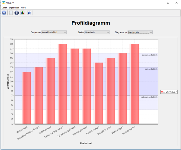 Die von unserer Firma im Auftrag von Pearson erstellte Auswertungssoftware ökonomisiert die Auswertung der Wechsler Intelligence Scale for Children - Version V und schützt Sie vor Auswertungsfehlern und damit auch vor Fehlinterpretationen der Testergebnisse. Das Programm berechnet aus den Rohwerten des Kindes automatisch alle Kennwerte, die auch auf dem Papierbogen berechnet werden können. Neben den Wertpunkten der Untertests, den primären und sekundären Indexwerten sowie dem Gesamt-IQ können auch Stärken und Schwächen ermittelt und primäre und sekundäre Diskrepanzvergleiche durchgeführt werden. Die Prozessanalyse ermöglicht außerdem einen Vergleich verschiedener Leistungen innerhalb der Untertests des auditiven Arbeitsgedächtnisses sowie des Mosaik- und Durchstreich-Tests. Zusätzlich enthält das Auswertungsprogramm einen schriftlichen Report, der die Ergebnisse im Gesamt-IQ und in den primären Indexwerten in kurzen Worten zusammenfasst. In unserem Beispielreport können Sie sich einen Überblick über die einzelnen Auswertungsmöglichkeiten verschaffen.